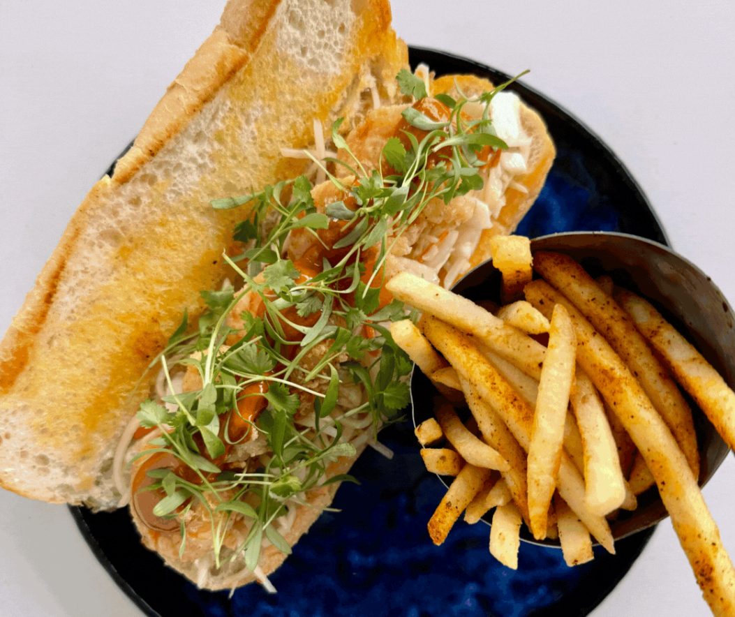 August Entree of the Month - Shrimp Po Boy Friday, August 1, 2025 11:00 AM Sunday, August 31, 2025 12:00 PM Google Calendar ICS August Entree of the Month - Shrimp Po BoyCrispy tempura shrimp layered with a crunchy Asian slaw, drizzled in sweet-chili lime sauce, and finished with daikon, cabbage, and gochujang aioli. Served with fries.Only $18