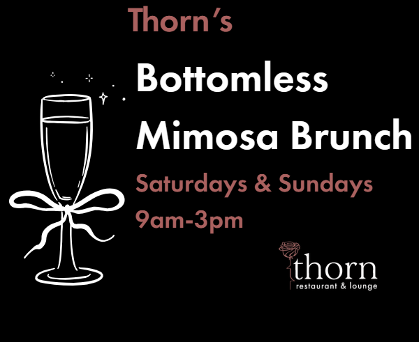 Celebrate the weekend with a Bottomless Mimosa Brunch, featuring flavors like pineapple and cranberry. For $30, toast to the weekend. 90-minute limit. Available every Saturday and Sunday with the purchase on an entree from 9am-3pm.