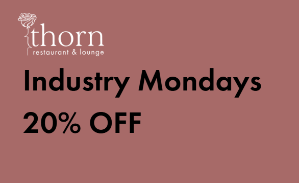 Hospitality pros, this one’s for you. Enjoy 20% off your entire bill every Monday at Thorn. Just bring recent proof of employment and let us take care of you for a change.