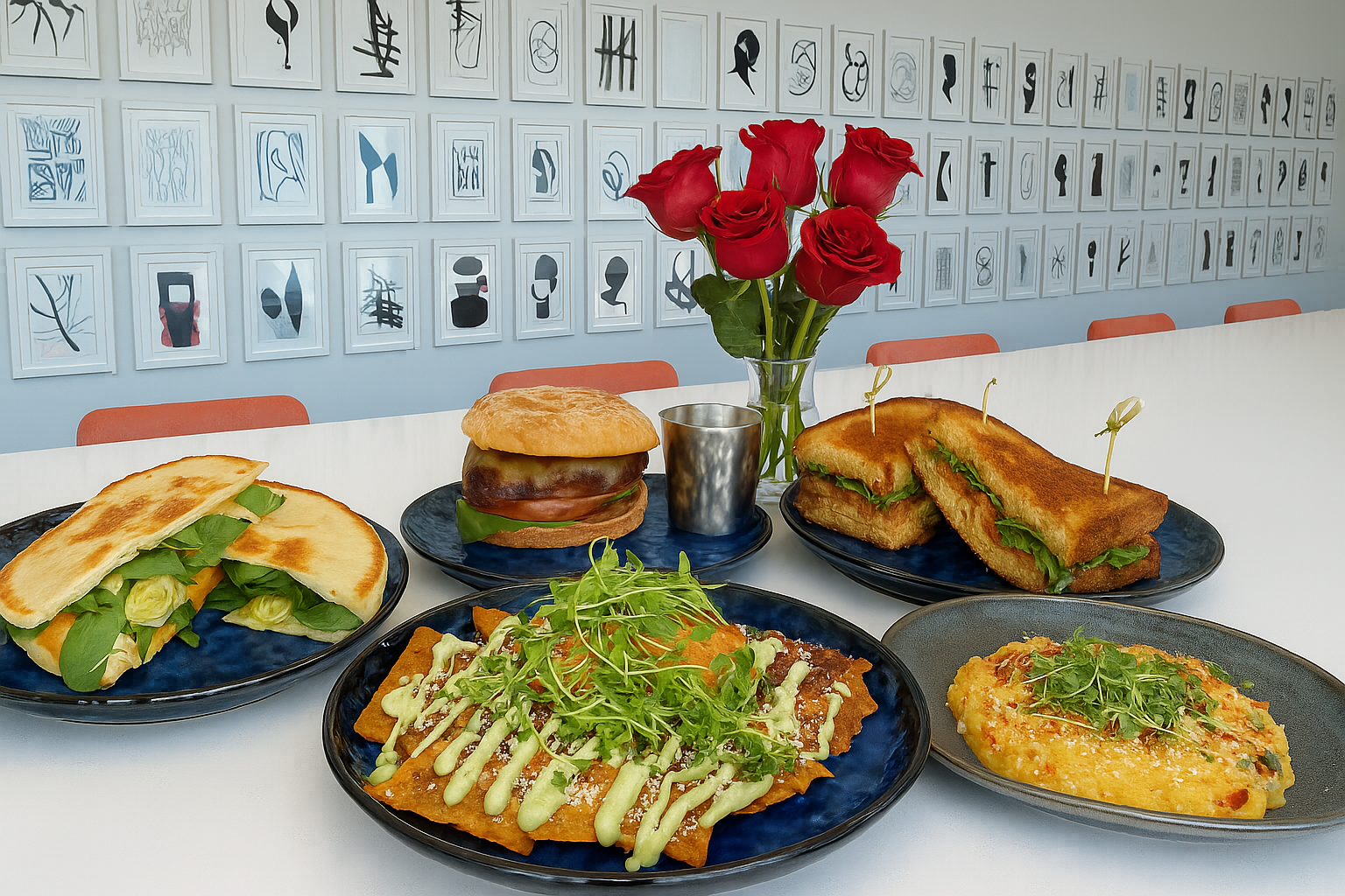 Canela Grilled Cheese, Medi Pita Sandwich, Seasonal Risotto, Birria Quiles, or Blackened Chicken Sandwich.